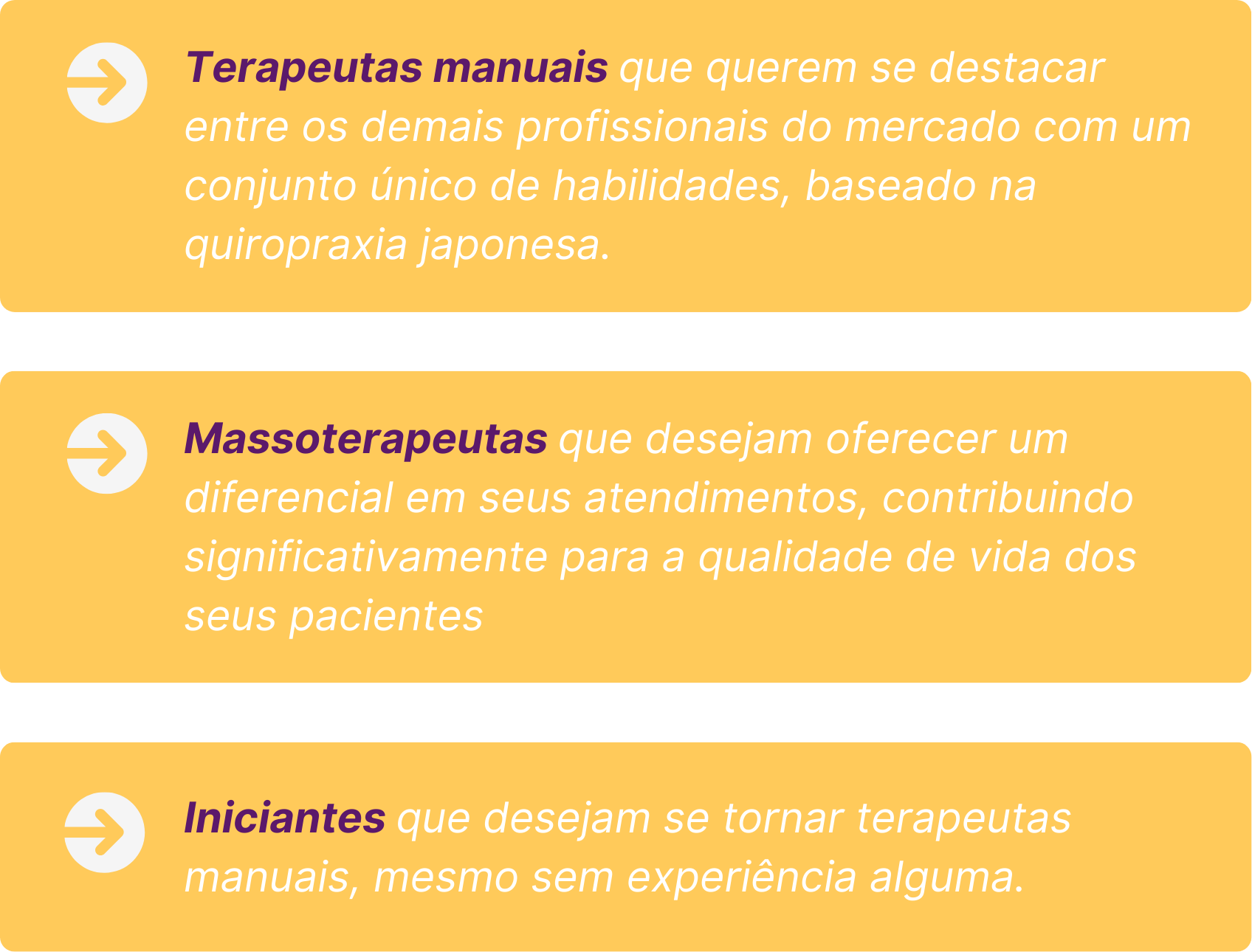 Esta formação é um curso completo que ensina técnicas milenares de quiropraxia japonesa, capacitando você para se tornar um terapeuta manual requisitado no mercado, especializado em ajudar pessoas a eliminar dores articulares e melhorar sua mobilidade, postura e qualidade de vida.